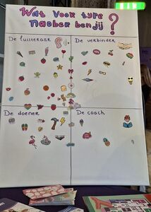 Een opening voor een goed gesprek was al aanwezig. Op een mooi groot bord kon iedere geïnteresseerde een sticker plakken bij de teamrol die het beste bij hem of haar paste. Er kon gekozen worden tussen: luisteraar, verbinder, doener en coach. Er waren opvallend veel luisteraars bij onze stand.